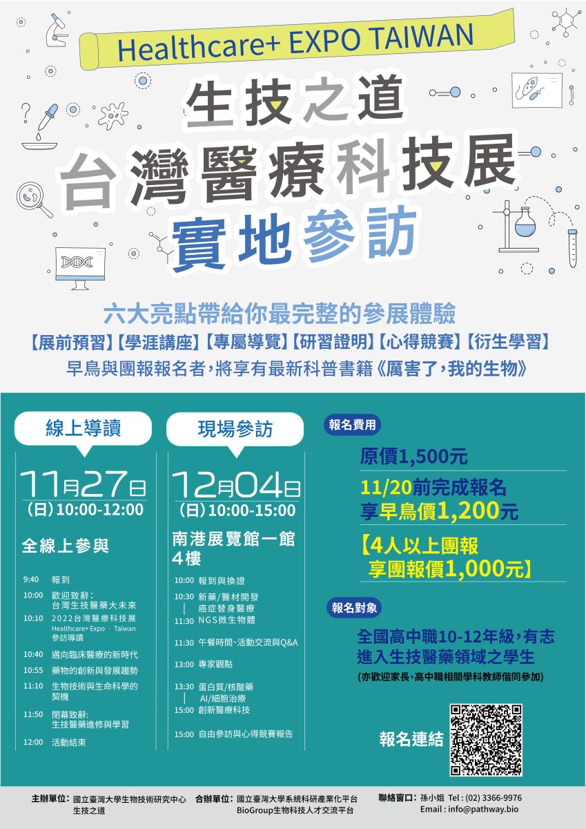 台灣大學生物技術研究中心訂於111年12月4日偕同生技之道平台辦理「生技之道 ~ 2022台灣醫療科技展現場參訪」活動,檢送活動海報電子檔 ,請惠予在貴校網站及電子看板宣傳周知,並轉知貴校生物科教師與家長會,鼓勵師生踴躍報名參加,請查照。