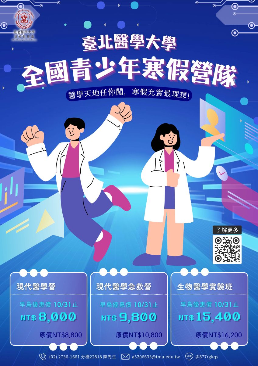 一、臺北醫學大學為鼓勵高中學子於寒假期間參與多元學習,將於115年1月17日至2月10日辦理【全國青少年高中寒假營隊】系列課程。課程結合理論與實作,由臺北醫學大學專業教師與附屬醫院專科醫師親自授課,並由學長姐全程陪伴,協助學生探索醫學領域、拓展視野。
