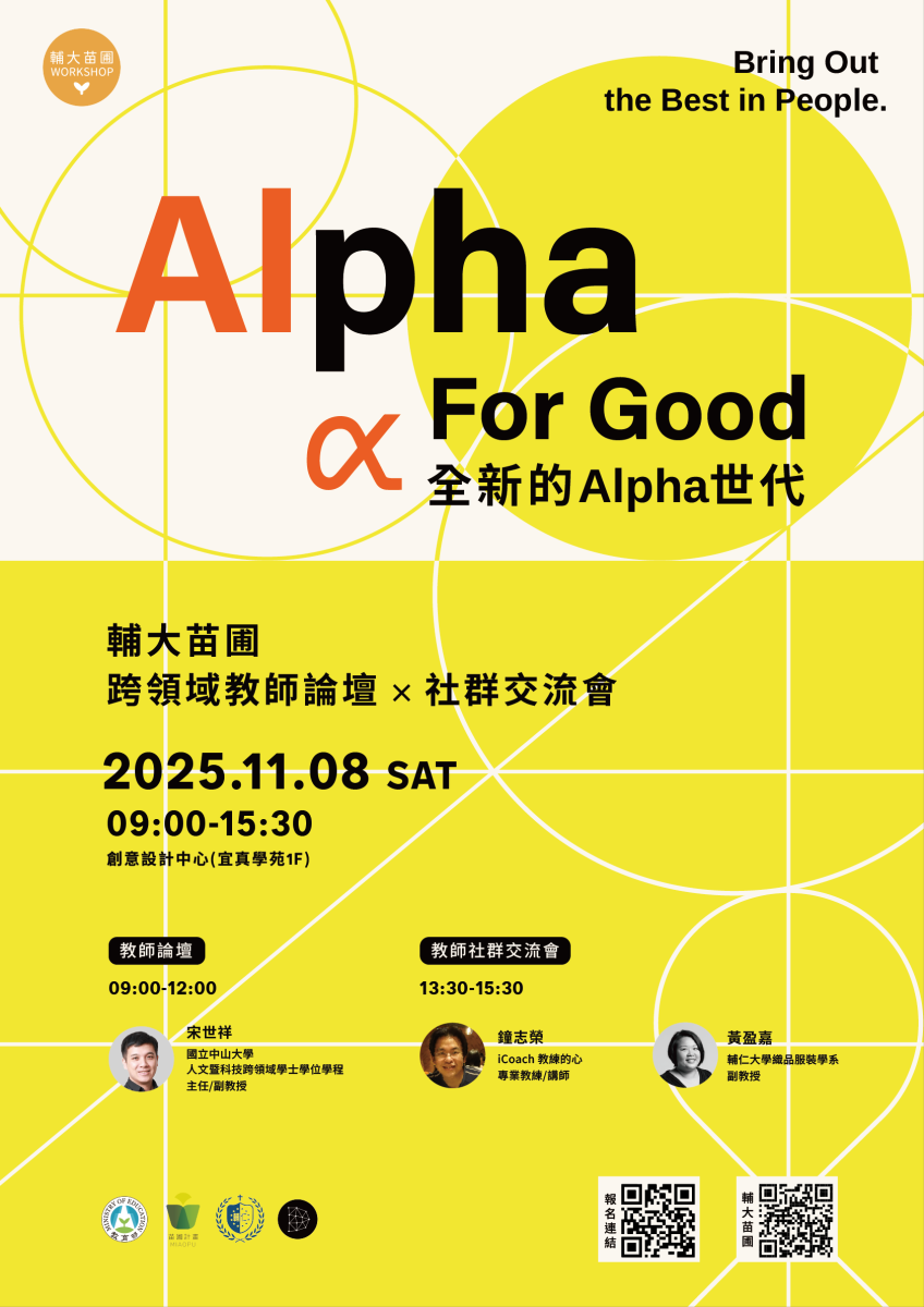 一、 活動目的:本活動由教育部「跨領域教師發展暨人才培育計畫」補助辦理,活動邀請國立中山大學宋世祥主任、iCoach教練的心鐘志榮教練及輔仁大學黃盈嘉副教授共同分享,探討AI時代下的跨域合作、創新教學與設計思考實踐。