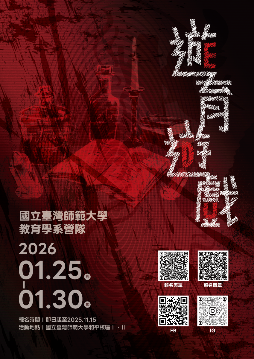 【轉知】國立臺灣師範大學教育學系擬辦理「2026教育營—遊育遊戲」活動Post author:輔導室Post published:2025-10-27Post category:--校外活動 / -輔導室國立臺灣師範大學教育學系擬辦理「2026教育營—遊育遊戲」活動,謹附相關活動海報(附件一)、簡章(附件二)。A102V0000U0000000_1141029708-0-1下載 Post Views: 50Read more articles上一篇文章【轉知】臺灣一滴優教育協會辦理「面對壓力不孤單—那些走過壓力的故事」線上講座下一篇文章【轉知】弘光科技大學校老人福利與長期照顧事業系辦理「第二屆長期照顧永續發展論壇-家庭照顧群像:多視角下的服務與實踐競賽」