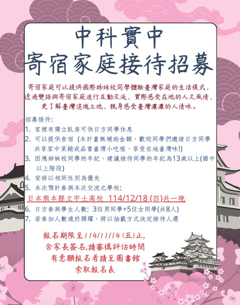 【公告】2025 日本熊本縣立宇土高校來訪寄宿家庭招募Post author:圖書館主任Post published:2025-11-04Post category:--重要公告 / -圖書館 / 最新消息 Post Views: 177Read more articles上一篇文章【轉知】大葉大學檢送「2026大葉大學護理學系BLS & BTLS證照班」活動資訊,歡迎有興趣者踴躍報名參加。下一篇文章【公告】2025 日本大阪府立千里高校來訪寄宿家庭招募