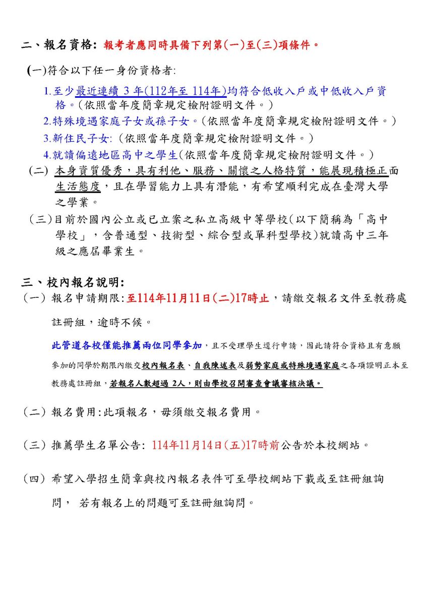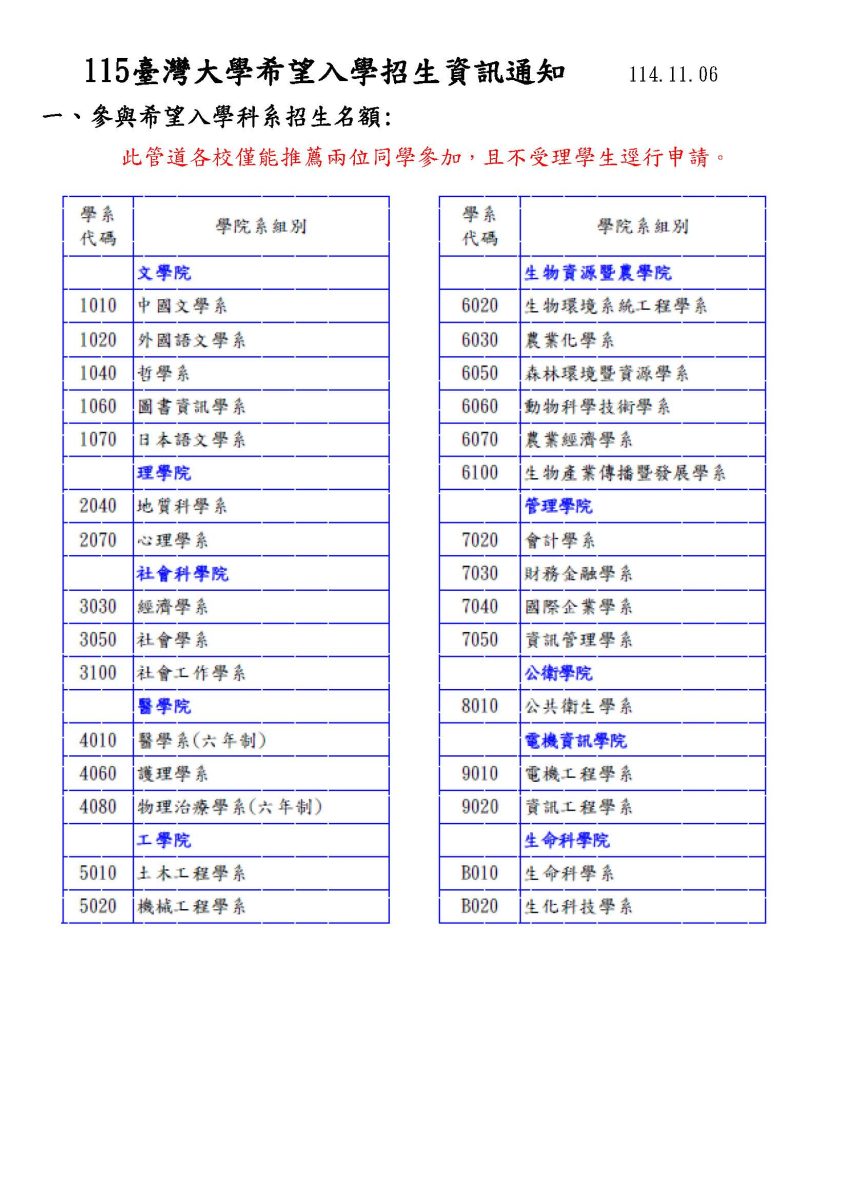 【升學】國立臺灣大學115學年度學士班【希望入學】招生校內報名(校內報名至114/11/11止)Post author:教務處 註冊組長Post published:2025-11-06Post category:--重要公告 / -升學資訊(高中部) / -教務處 / 註冊組115台大希望入學升學資訊通知校內報名用下載115台大希望入學校內報名表下載115台大希望入學招生簡章下載希望計畫自述書下載報名表件-115低收及中低收證明下載報名表件-利他證明彙示表下載 Post Views: 50Read more articles上一篇文章【轉知】「AI for a Better Future 人工智慧創新應用競賽全國決賽」下一篇文章【公告】日本筑波科學競賽Tsukuba Science Edge 2026