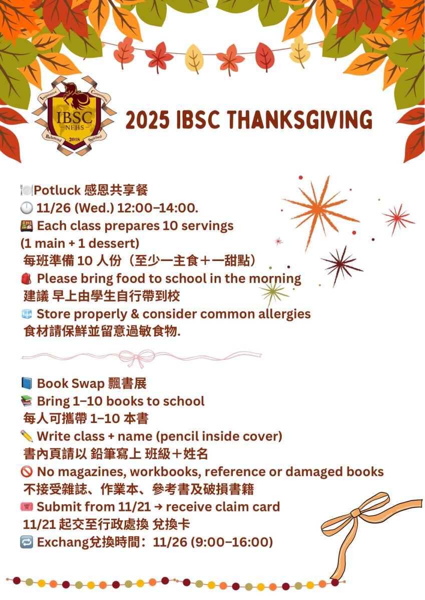 We are delighted to share that IBSC will host a Thanksgiving Potluck Lunch and Book Swap Event on November 26 (Wed.). We warmly welcome our students to participate and enjoy this meaningful cultural and sharing experience.