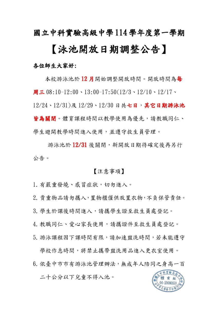 【公告】12月份游泳池開放日期Post author:體育組長Post published:2025-11-20Post category:--重要公告 / 體育組 Post Views: 36Read more articles上一篇文章【轉知】教育部為「全民+1 政府相挺」普發現金領取及防詐事宜下一篇文章【轉知】國立高雄科技大學辦理技職推廣活動「動遊飛行技-技職見學遊程」