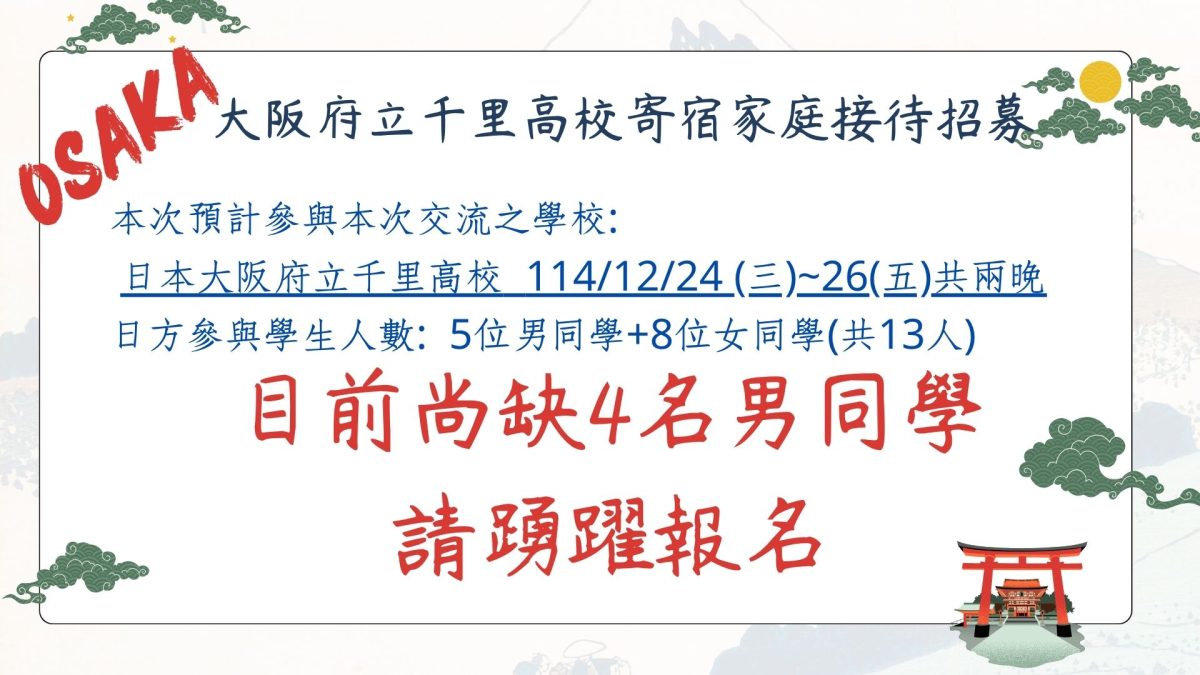【公告】持續招募2025 日本大阪府立千里高校來訪寄宿家庭(四名男同學)Post author:圖書館主任Post published:2025-11-21Post category:--重要公告 / -圖書館經過第一輪報名之後,目前尚缺4名男同學接待,請有意願的同學洽詢圖書館主任,謝謝! Post Views: 44Read more articles上一篇文章【公告】IBSC G7–12 校外教學期間 After-School Club 調整公告 Adjustment of After-School Clubs During the G7–12 Field Trip (Nov. 27–28)下一篇文章【轉知】臺灣銀行就學貸款提供多元繳款方式