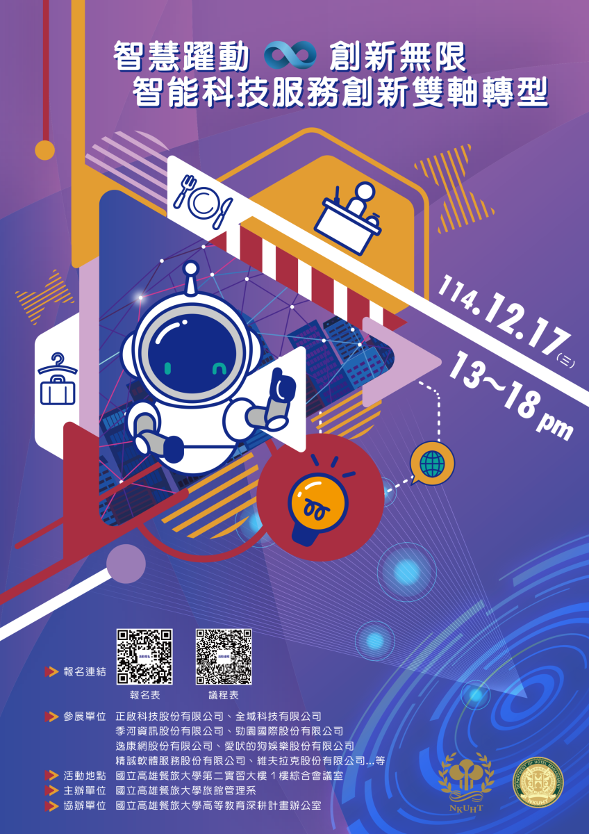 【轉知】國立高雄餐旅大學旅館管理系舉辦「智慧躍動 ️創新無限-智能科技服務創新雙軸轉型」Post author:教務處教學組Post published:2025-11-21Post category:--教師研習一、 旨揭活動謹訂於114年12月17日(星期三)下午1時至6時辦理。活動地點為本校第二實習大樓一樓綜合會議室。二、 本次活動將邀請旅館業者與資訊科技廠商進行展示交流,促進跨領域的互動合作,激發更多創新應用的可能,誠摯邀請各高中職及大專校院師長蒞臨。三、 活動報名連結: https://forms.cloud.microsoft/r/fjbfd1YVPj,報名即日起至114年12月8日(星期一)。四、 隨函檢附活動電子海報乙份,敬請協助公告。 Post Views: 11Read more articles上一篇文章【轉知】教育部智慧感測電路聯盟與社團法人臺灣半導體產學研發聯盟辦理「TIARA 高中半導體微課程教材教師研習會」下一篇文章【轉知】國立嘉義女子高級中學協作共好計畫辦理全國自主學習相關講座:「Google AI 輔助學生專題製作與學習」