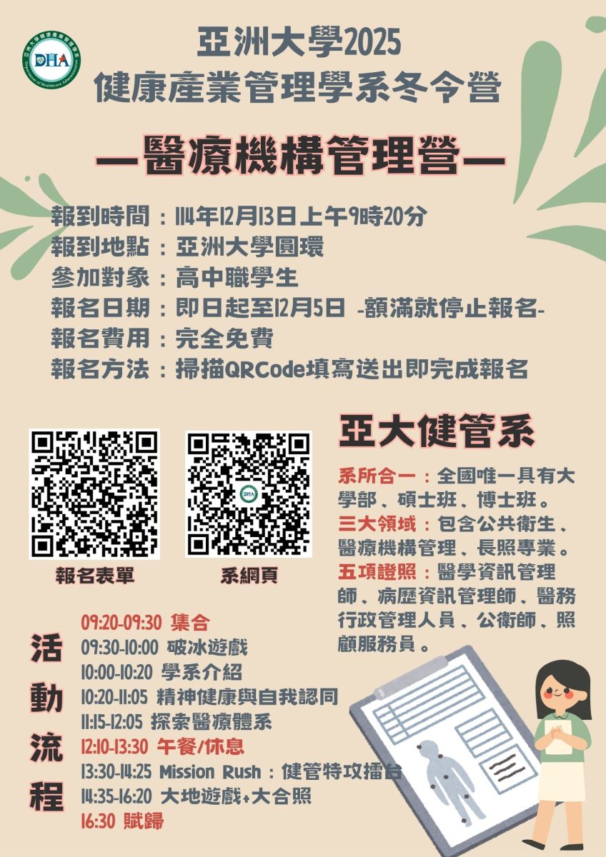 【轉知】亞洲大學健康產業管理學系舉辦「2025健康產業管理學系冬令營」