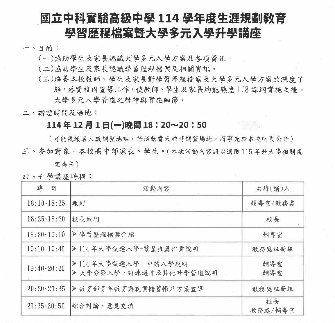 【公告】本校將於114年12月1日舉辦「學習歷程檔案暨大學多元入學升學輔導講座」Post author:輔導室Post published:2025-11-28Post category:--重要公告 / -升學資訊(高中部) / -輔導室 / 最新消息時間:114 年12 月1 日(一)晚間 18:20-20:50地點:國立中科實驗高級中學 行政大樓三樓 大會議室( 一)◈ 時間及流程如下,歡迎家長們踴躍參加~~ Post Views: 46Read more articles上一篇文章【轉知】114年臺灣客語寫作培訓營(中部場)下一篇文章【轉知】財團法人中華民國兒童福利聯盟基金會進行「台灣國中生校園生活狀況調查」