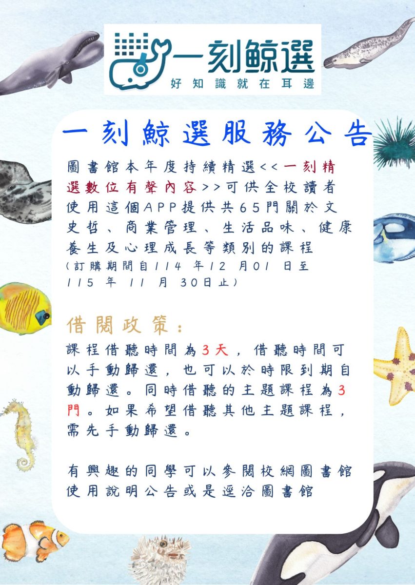 【公告】圖書館續訂「一刻鯨選」服務
