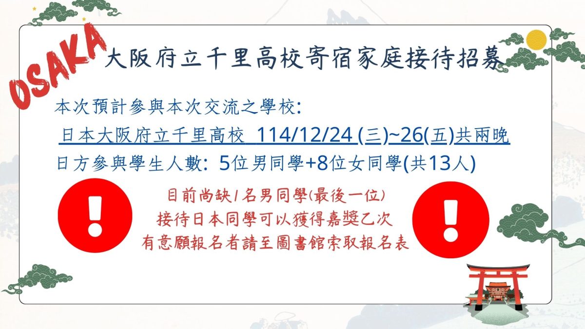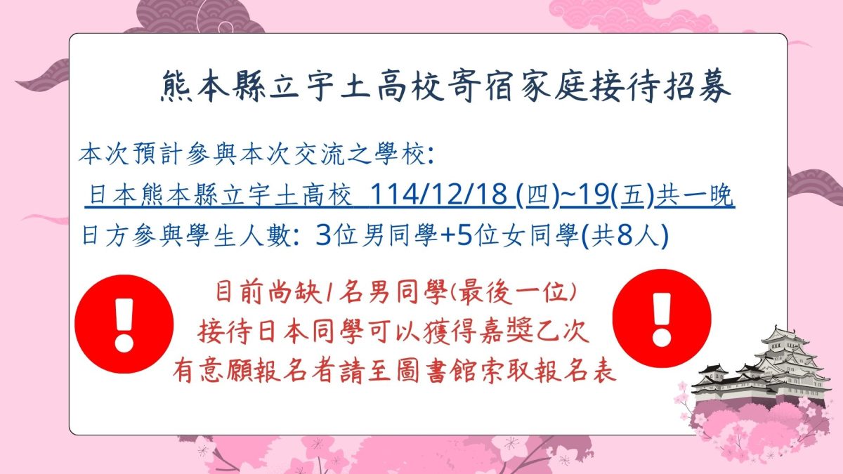 【公告】持續招募2025 日本宇土高校及千里高校來訪寄宿家庭Post author:圖書館主任Post published:2025-12-01Post category:--重要公告 / -圖書館 Post Views: 220Read more articles上一篇文章【公告】圖書館續訂「一刻鯨選」服務下一篇文章【轉知】115學年度四技二專特殊選才入學聯合招生相關資訊