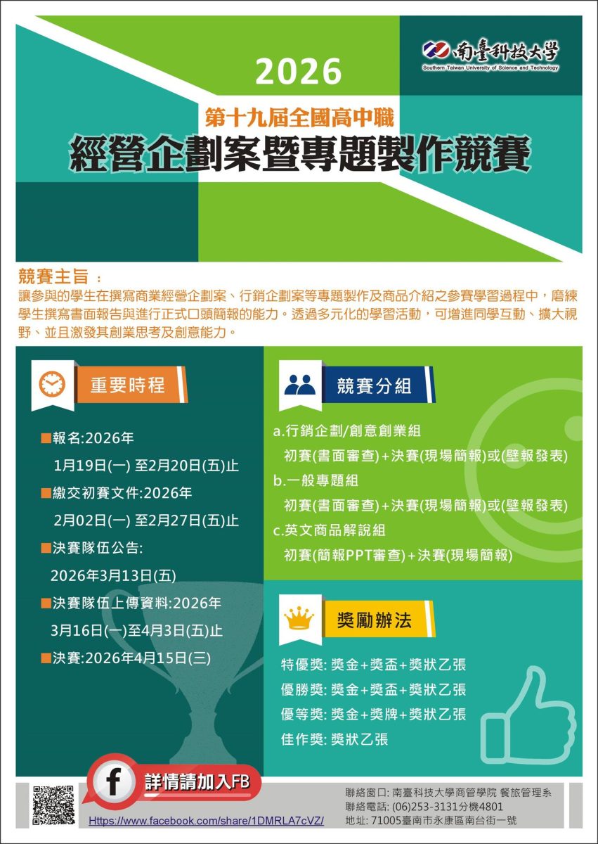 二、 競賽辦法及報名表:請至本校商管學院網站下載(http://business.stust.edu.tw/tc/node/Proposal)。