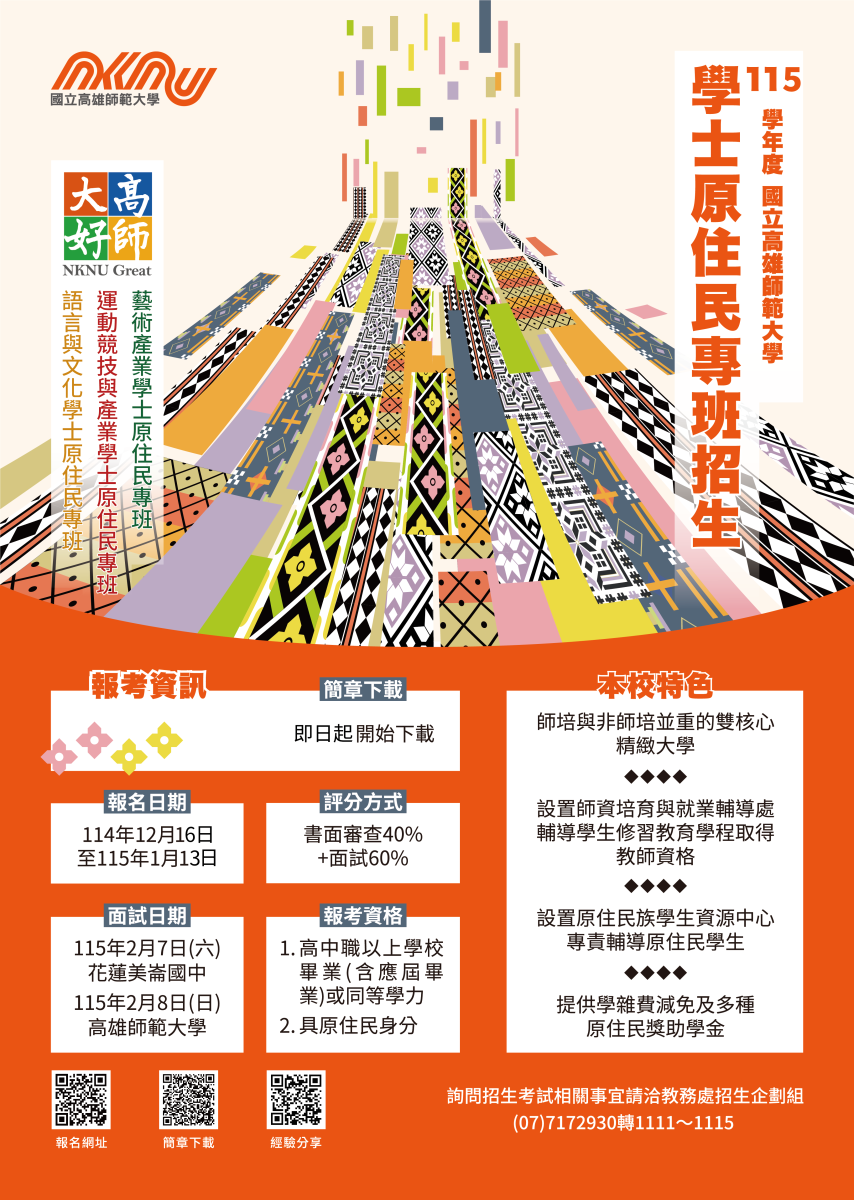 【轉知】國立高雄師範大學115學年度學士原住民專班招生資訊Post author:教務處 註冊組長Post published:2025-12-17Post category:--重要公告 / -升學資訊(高中部) / -教務處 / 最新消息 / 註冊組一、報名日期自114年12月16日起至115年1月13日止,招生簡章即日起可免費下載。二、詳細招生資訊請參閱高師大教務處招生企劃組網頁,日間學制各項招生考試專區https://c.nknu.edu.tw/aca/Default.aspxGI=4。國立高雄師範大學115學年度學士原住民專班招生簡章下載 Post Views: 15Read more articles上一篇文章【轉知】國立屏東科技大學115學年度科技農業進修學士學位學程單獨招生訊息