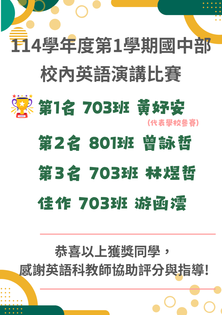 【公告】國中部114學年度校內英語演講比賽得獎名單Post author:實驗研究組長Post published:2025-12-29Post category:--重要公告 / 榮譽榜 Post Views: 46Read more articles上一篇文章【轉知】NEHS Parental Open Speech – Open to IBSC Parents