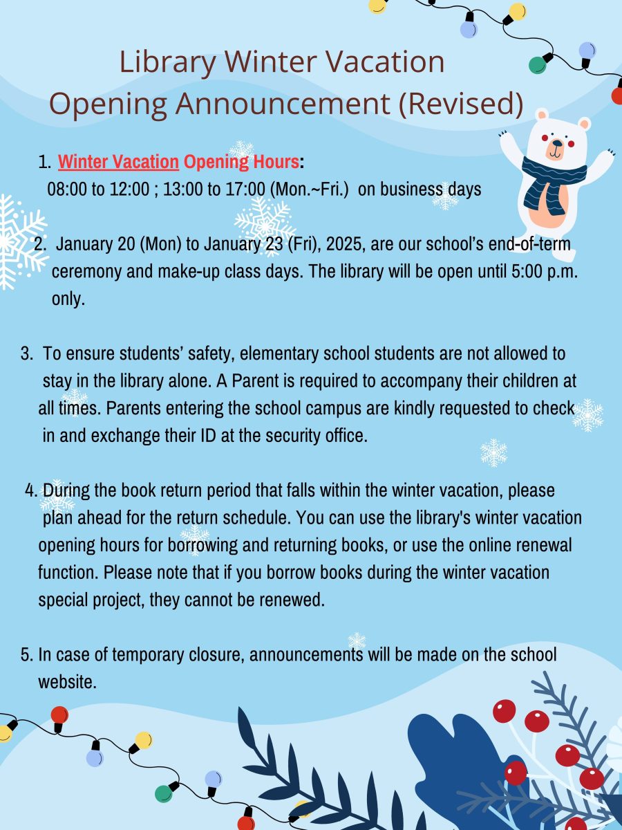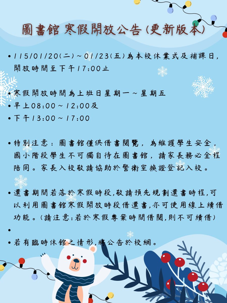 【公告】圖書館寒假期開放公告(更新) Library Winter Vacation Opening Announcement (Revised)Post author:圖書館主任Post published:2026-01-08Post category:--重要公告 / -圖書館 Post Views: 183Read more articles上一篇文章【公告】高中部114學年度第1學期第3次定期考考程表(更新1/20休業式後流程)下一篇文章【升學】115年國中教育會考事宜