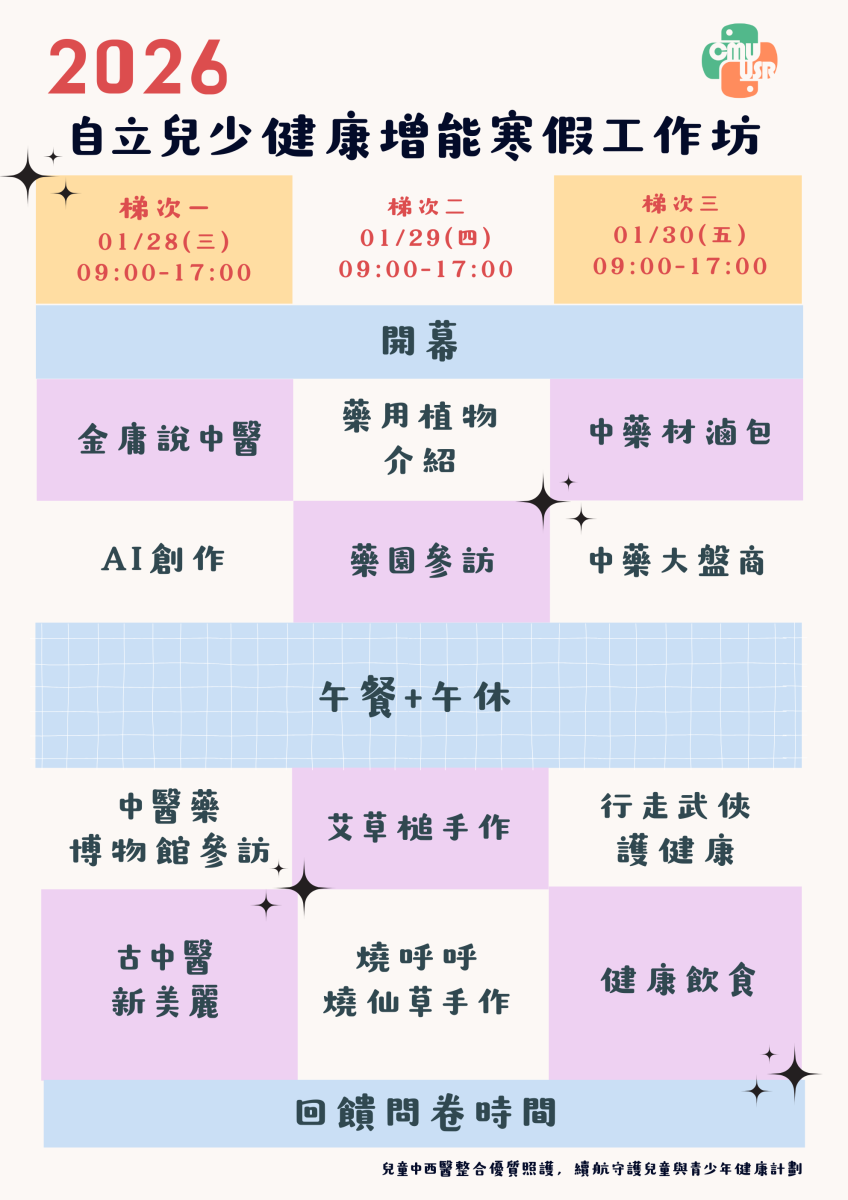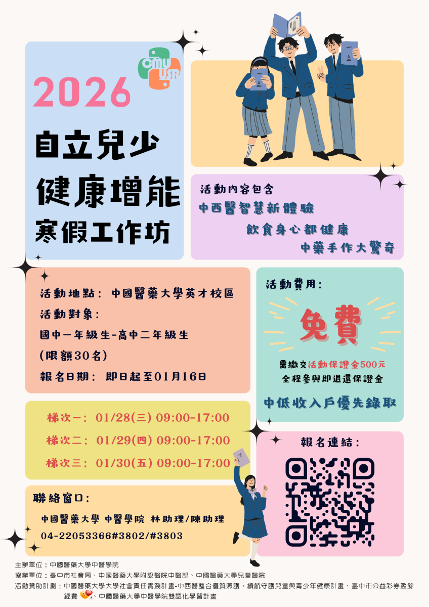 【轉知】中國醫藥大學2026《自立兒少健康增能寒假工作坊》活動