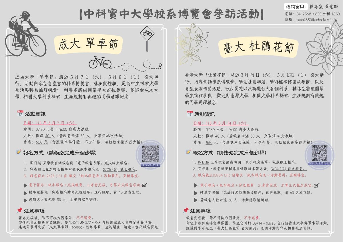 本校輔導室將於3/7(六)帶隊前往成大單車節、3/14(六)帶隊前往臺大杜鵑花節,歡迎對臺灣大學和成功大學相關大學科系探索、生涯規劃有興趣的同學踴躍報名!