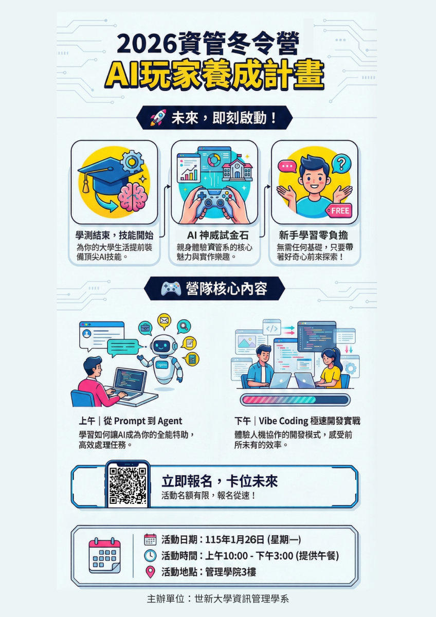 【轉知】世新大學資訊管理學系辦理寒假高中營隊「AI 玩家養成計畫|氛圍協作開發體驗營」