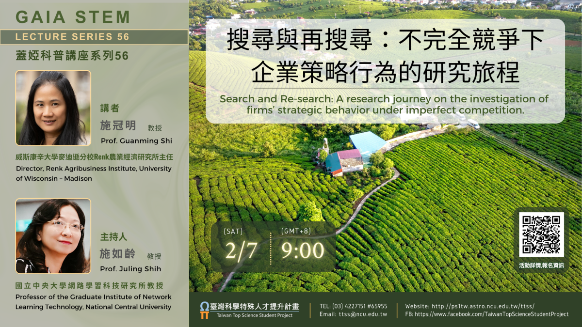 一、 本次講座邀請威斯康辛大學麥迪遜分校Renk農業經濟研究所施冠明教授擔任主講。施教授研究企業在非完全競爭市場中的策略行為,亦關注新科技的採用、獲利與影響,以及開發中經濟體的環境與發展議題。講座將讓我們了解企業在不完全競爭的市場下,如何做出決策並影響市場。