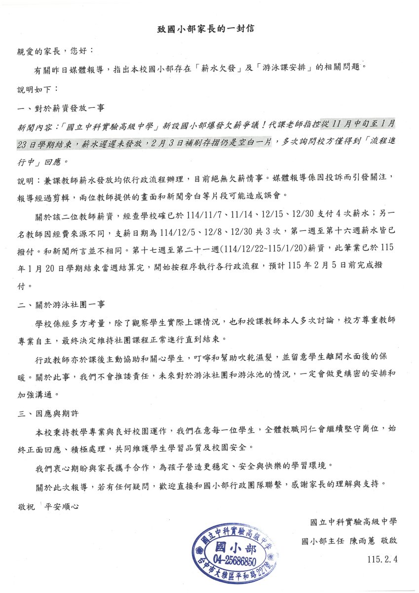 【公告】致國小部家長的一封信Post author:中科實中國小部Post published:2026-02-04Post category:--重要公告 / 招生資訊(國小部) / 最新消息 Post Views: 192Read more articles上一篇文章【轉知】農業部生物多樣性研究所辦理「愛自然(iNaturalist)公民科學家推廣計畫到校服務暨戶外教育」下一篇文章【公告】115學年度國中部招生流程