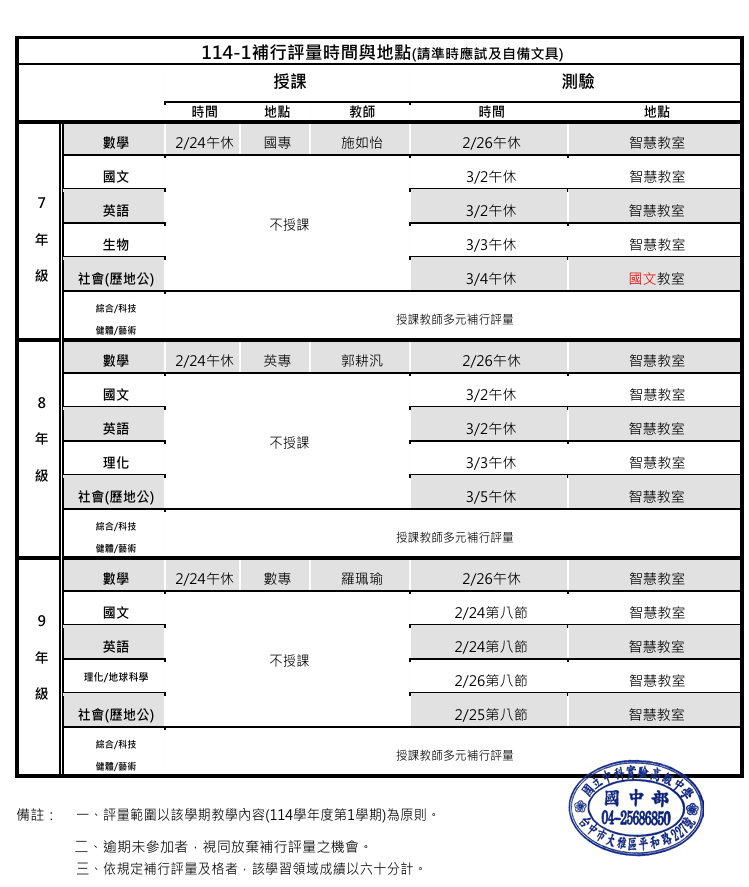 【公告】114學年度第1學期國中部補行評量時間、地點及題庫Post author:試務組長Post published:2026-02-06Post category:--重要公告 / 最新消息 / 試務組國中部預計於115/2/23(一)發放114-1補行評量通知單,請家長簽名後,於115/2/27前,以班級為單位繳回試務組存查。各科題庫如附件,請同學多加練習。1國文科-七年級-題庫下載1國文科-八年級-題庫下載1國文科-九年級-題庫下載2英語科-七年級-題庫下載2英語科-八年級-題庫下載2英語科-九年級-題庫下載3歷史科-八年級-題庫下載3歷史科-九年級-題庫下載4地理科-七年級-題庫下載4地理科-八年級-題庫下載4地理科-九年級-題庫下載5公民科-七年級-題庫下載5公民科-八年級-題庫下載5公民科-九年級-題庫下載6生物科-七年級-題庫下載6理化科-八年級-題庫下載6理化科-九年級-題庫下載6地球科學-九年級-題庫下載 Post Views: 69Read more articles上一篇文章【公告】115學年度國中部新生報名狀態及招生流程