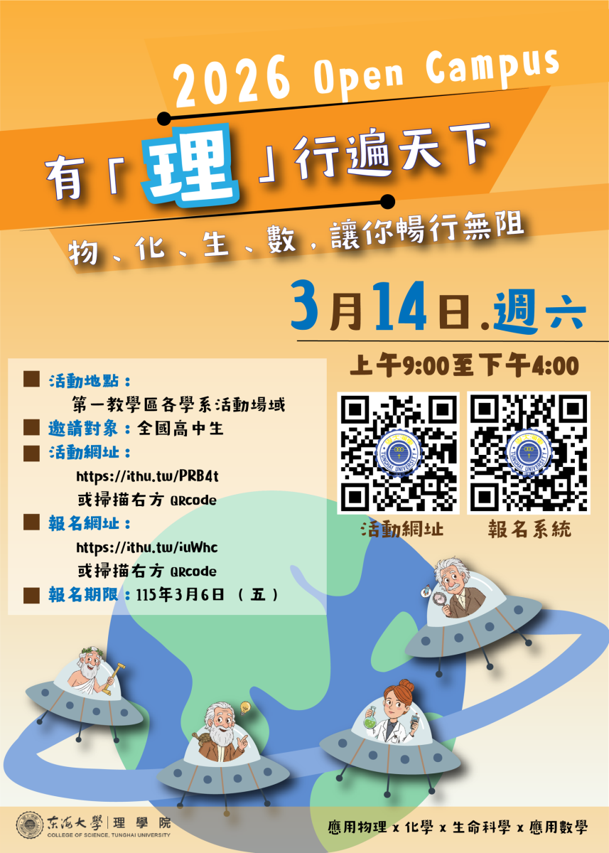 【轉知】東海大學理學院辦理「2026年Open Campus 有『理』行遍天下,物.化.生.數.讓你暢行無阻」活動