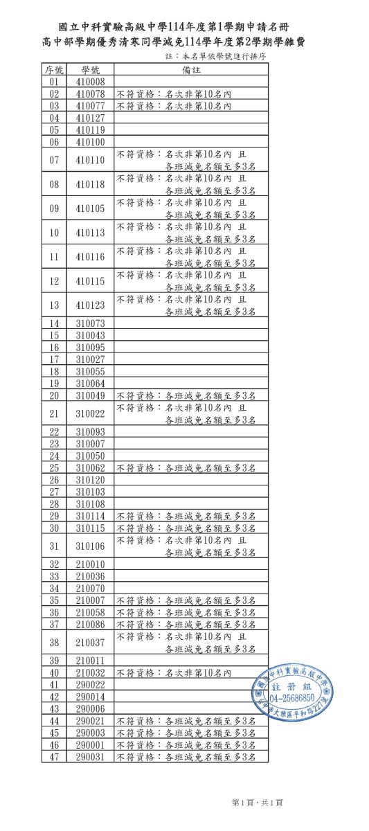【公告】114學年度第2學期高中部優秀清寒同學減免學雜費審核結果(114學年度第1學期申請)Post author:註冊組管理員Post published:2026-02-24Post category:--重要公告 / 最新消息 / 獎助學計畫 / 註冊組 Post Views: 54Read more articles上一篇文章【轉知】馬偕醫學大學辦理「2026馬偕醫學大學線上OPENDAY活動」下一篇文章【公告】114學年度第2學期 優秀清寒學生獎學金申請(高中部)
