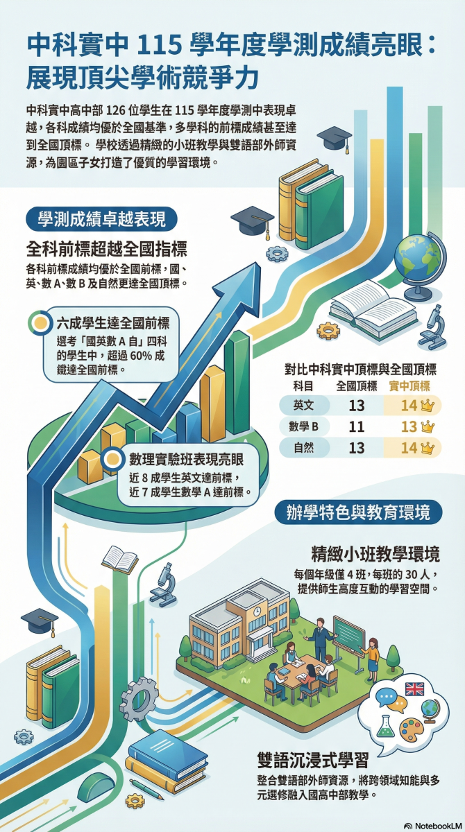 【公告】中科實中115學年度大學學測成績表現亮眼Post author:教務處 註冊組長Post published:2026-02-26Post category:--重要公告 / -升學資訊(高中部) / -教務處 / 升學資訊 / 最新消息 / 校園新聞 / 校園生活 / 榮譽榜 / 註冊組115學測成績公告稿下載 Post Views: 221Read more articles上一篇文章【轉知】中山醫學大學物理治療學系「中山物治系Open Day」活動下一篇文章【升學】中科實中115學年度各升學管道校內作業時程表-修正公告