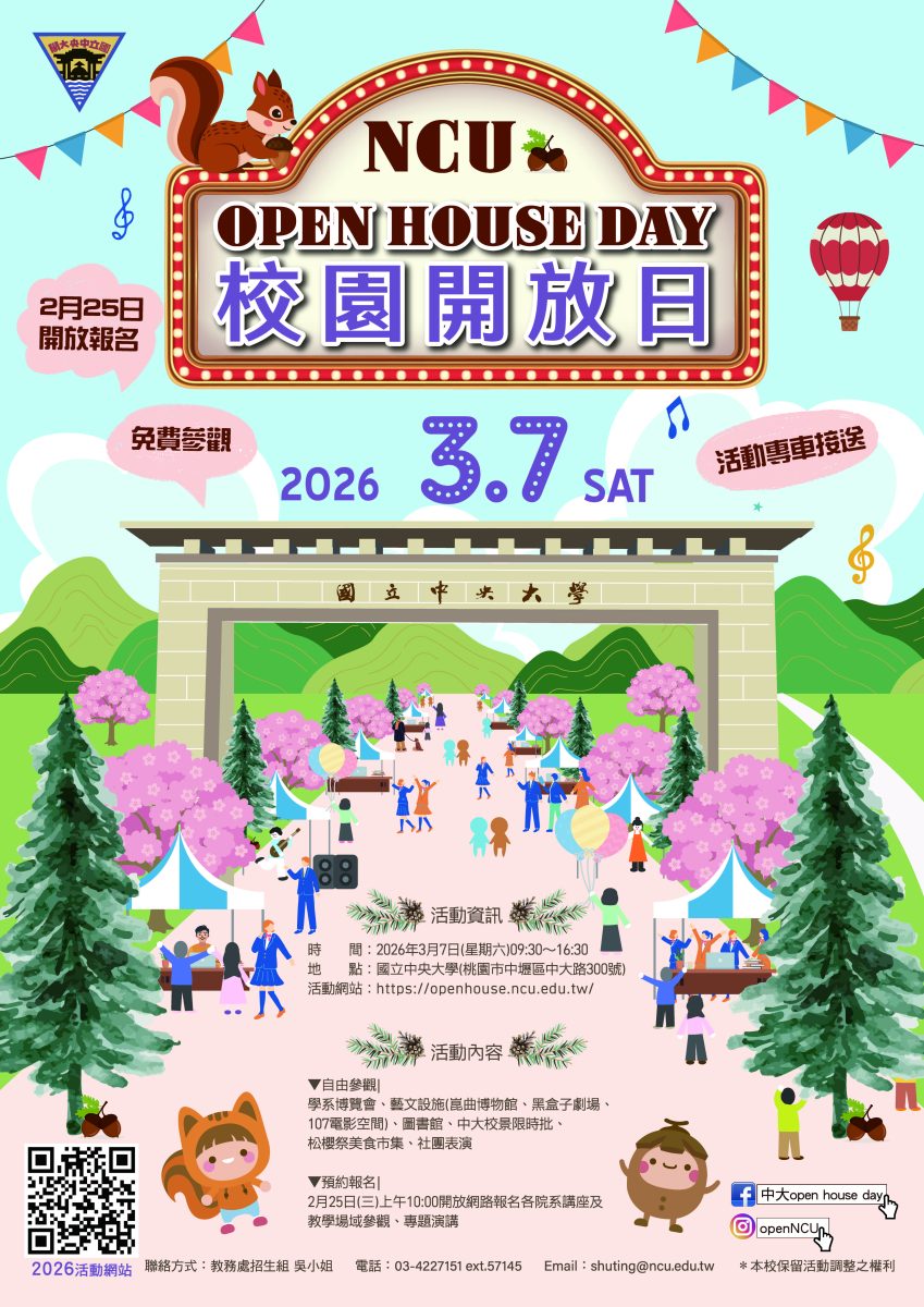 Instagram:openNCU。活動聯絡人:國立中央大學教務處招生組吳小姐,電話:03-4227151分機57145,E-mail:shuting@ncu.edu.tw。