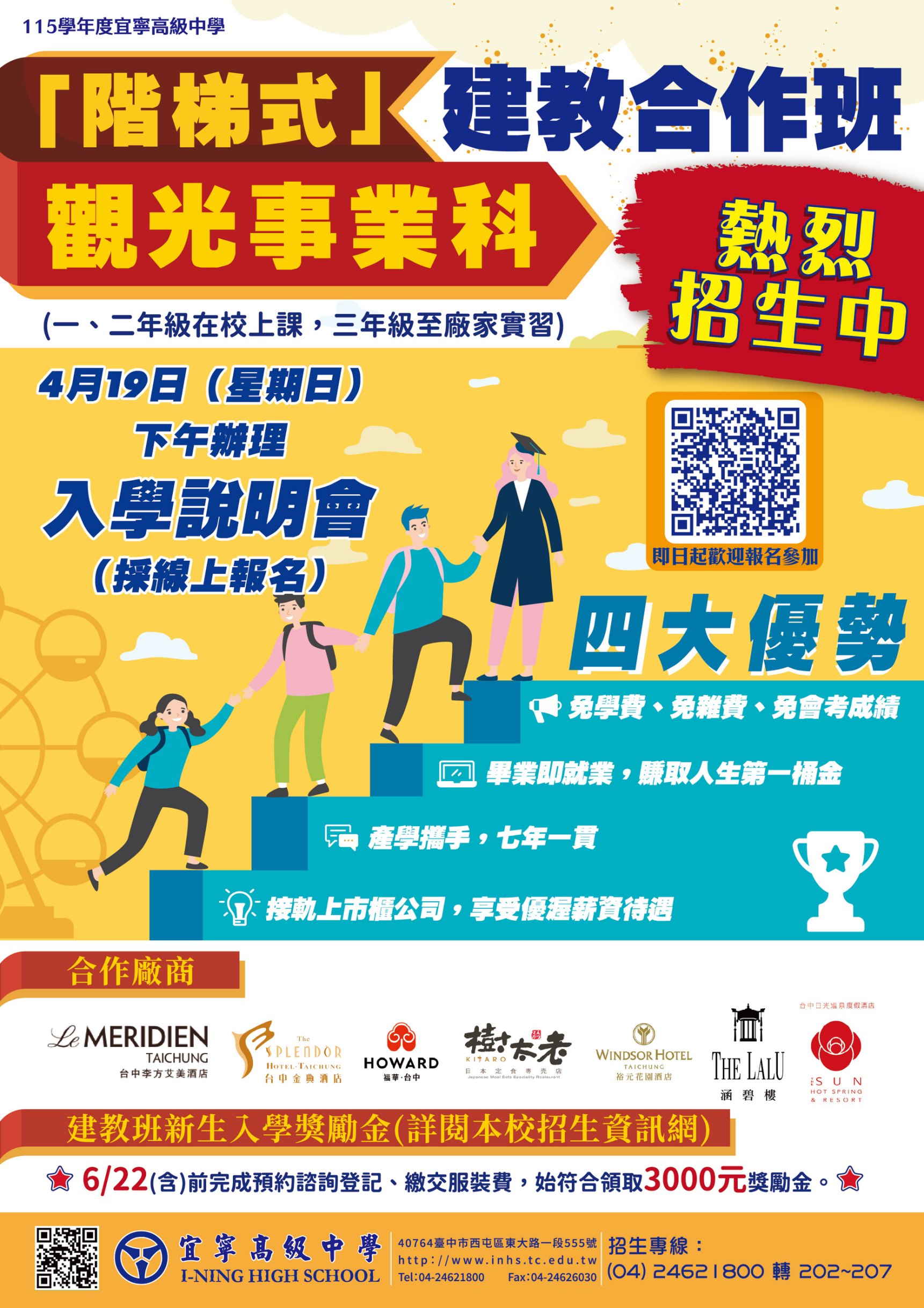【轉知】宜寧學校財團法人臺中市宜寧高級中學「階梯式建教合作班學制暨合作廠商說明會」Post author:試務組長Post published:2026-03-06Post category:-升學資訊(國中部) / 升學資訊 / 最新消息 / 試務組二、活動時間:115年4月19日(星期日),下午2點起;活動地點:宜寧高中行政大樓五樓閱覽室。三、報名方式:採網路(請掃描海報QR Code)報名,或撥打招生專線04-24621800分機202~207,報名截止日為4月13日(星期一)。宜寧學校財團法人臺中市宜寧高級中學「階梯式建教合作班學制暨合作廠商說明會」下載宜寧學校財團法人臺中市宜寧高級中學檢送「階梯式建教合作班學制暨合作廠商說明會」附件下載 Post Views: 19Read more articles上一篇文章【轉知】國立臺北大學各學系「115學年度大學申請入學審查資料準備指引」歡迎運用下一篇文章【轉知】防制學生藥物濫用(含新興毒品)、防詐宣導