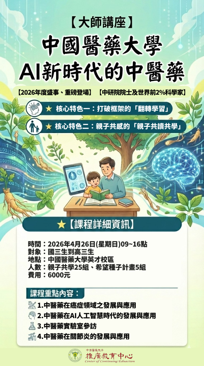 【轉知】中國醫藥大學推廣教育中心【2026大師講座】AI新時代的中醫藥宣傳資料Post author:教務處教學組Post published:2026-03-11Post category:--校外活動一、 講座時間:2026年04月26日(日),09點到16點,詳細資訊請至連結(https://cce.cmu.edu.tw/news/462)查詢。二、 招生對象:國三到高三學生,親子共學25組、希望種子計畫5組。三、 報名日期:即日起至04/12止。四、 上課地點:中國醫藥大學英才校區(台中市北區學士路91號)。五、 檢附講座海報及簡章如附件,敬請協助公告周知。六、 洽詢電話:04-22054326或加入官方Line詢問(@CCE22054326)。AI新時代的中醫藥下載 Post Views: 14Read more articles上一篇文章【轉知】臺中市豐原區富春國民小學科技中心辦理三月份教師增能研習下一篇文章【轉知】中原大學舉辦「逐夢中原」活動