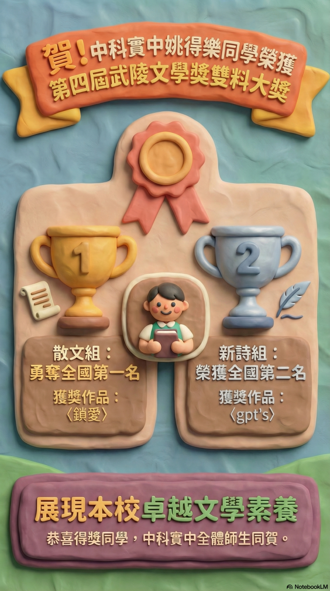 【恭賀】高中部204班姚得樂同學參加第四屆武陵文學獎榮獲散文組第一名、新詩組第二名Post author:教務處教學組Post published:2026-03-24Post category:--重要公告 / 榮譽榜 Post Views: 65Read more articles上一篇文章【公告】114學年度第2學期優秀清寒同學減免學雜費申請名單下一篇文章【招生】115學年度中科實中【高中部】直升入學報名須知自5/22至6/5下午17時止