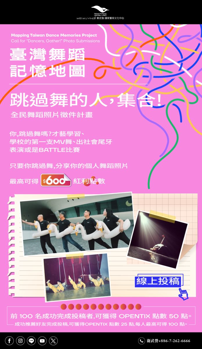 (二) 「跳過舞的人,集合!」全民舞蹈照片徵件活動如附件簡章或參考衛武營官網網址:https://npacwwy.tw/en08gMrIj。