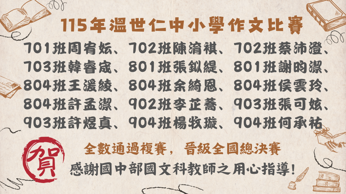 【恭賀】國中部參加溫世仁文教基金會「115年中小學作文比賽」之入圍決賽名單Post author:實驗研究組長Post published:2026-04-27Post category:--重要公告 / 實驗研究組 / 榮譽榜 Post Views: 53Read more articles上一篇文章【轉知】115年度全國公私立高級中等學校「原住民文化之旅」研習營